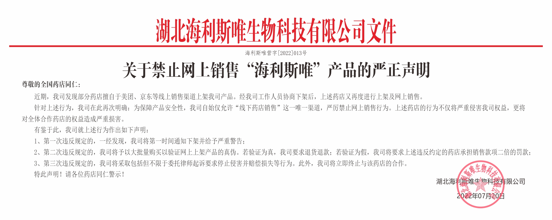 關于禁止網上銷售"海利斯唯"產品的嚴正聲明